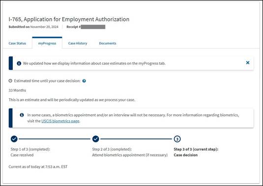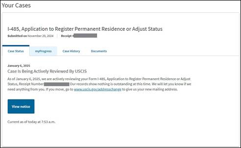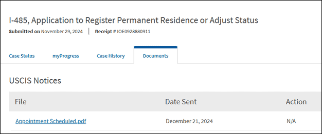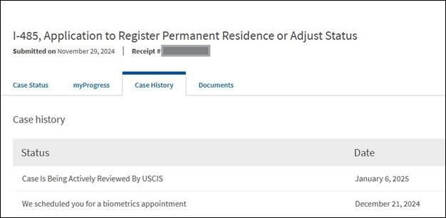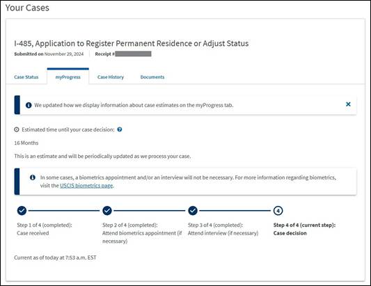 While on your way home, you may receive multiple emails from USCIS about updates made to your case. Log in to your USCIS account to check the updates. You will see that the dates are updated on both of your cases. When you check the Progress tab, both your I-485 and I-765 will be updated to the last step case decision. You may be exempted from the interview step of your I-485 if it is completed as soon as you are done with biometrics.