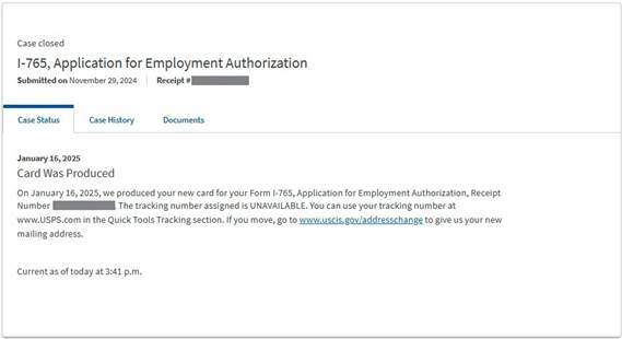 On January 16, 2025, an email notification received that an update has been made in my USCIS account. When I checked, it said that my work authorization card was produced. Case Closed.