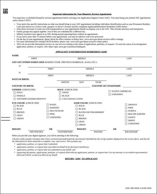 Before your appointment, make sure to fill out the Applicant’s Information Worksheet (AIW), which is included in the ASC Appointment Notice. This worksheet requires basic information about the applicant and will be taken during your biometrics. On the day of your appointment, arrive at the service center 15 minutes before your scheduled time. You are not allowed to enter the service center earlier than your appointment time.