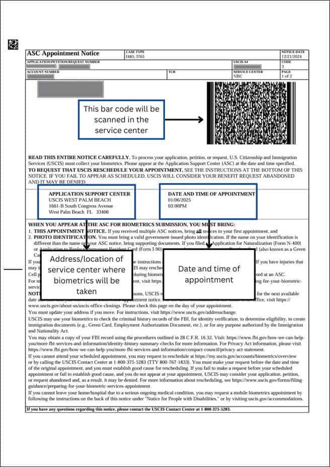 There are two pages of ASC Notification. The first page contains details about your application such as application numbers, online account number, case type, USCIS Alien number, notice date, biometric code*, applicant’s name and address, application center and date and time of the appointment.